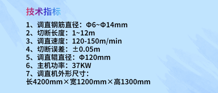 | 公司主要產(chǎn)品:冷軋機(jī)、冷軋?jiān)O(shè)備、收線機(jī)、兩肋冷軋機(jī)、鋼筋調(diào)直切斷機(jī)、鋼筋調(diào)直機(jī)、鋼筋切斷機(jī) |